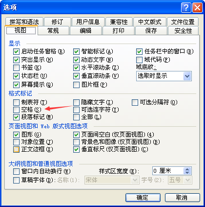 2、在选项设置中,点击【视图】,可以看到【空格】是没有勾选的。点击勾选【空格】。