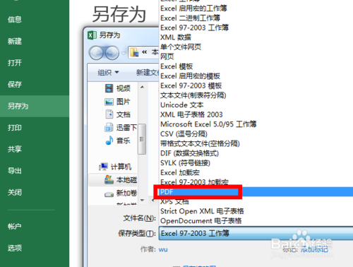 2、然后在弹出的对话框中选择保存类型,在下拉菜单中点击PDF,再点击保存。