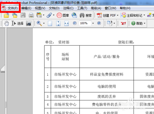 2、然后打开保存的PDF文档,点击左上角的文件。