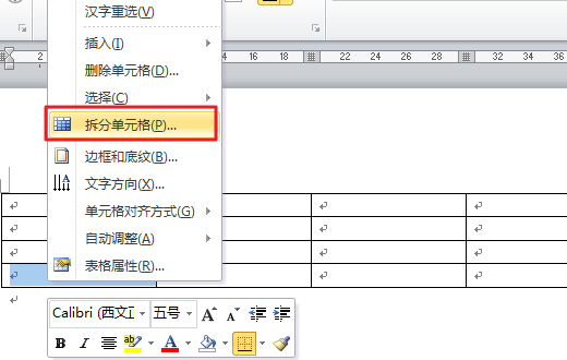 4、如果想在表格内的单元格中加行,选中想要加行的单元格,单击右键点击拆分单元格。