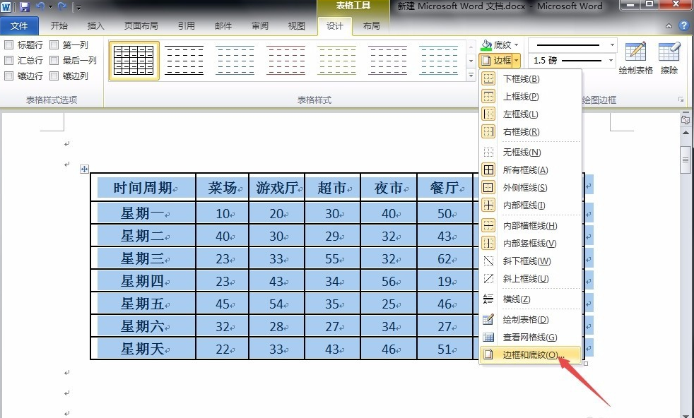 1、首先我们将整个表格选中,打开“设计”菜单下的“边框”-“边框和底纹”选项。