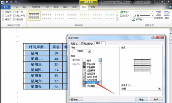 2、在弹出对话框中,我们打开“底纹”选项卡,在“图案”中选择自己想要的底纹样式。
