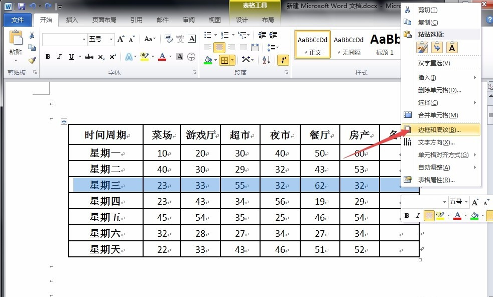 5、当然,如果只想设定单行或单列的表格,可以将需要设置的行或者列选中,单击鼠标右键,选择“边框和底纹”选项。