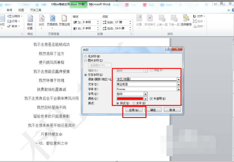 如果需要加深,可在设置水印时的对话框中选择深一些的颜色,并去掉半透明的勾