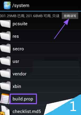 1、打开R.E管理器,进入system目录,找到build.prop文件。然后在右上角选择“挂载读写”。