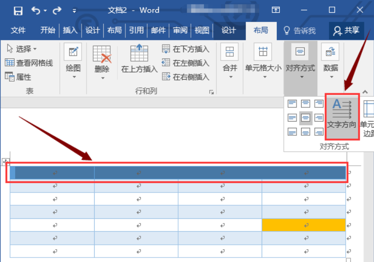 6、这时候文本更改位居中对齐,接着选中表格首行,然后更改文字方向。