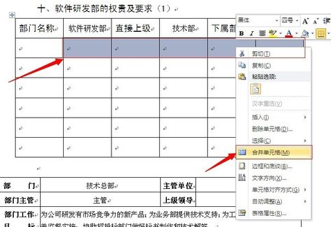 6、由于操作失误,我们多合并了第三行,那么就定义第一行,右键,在下方增加一行,再增加一行,把原来的第二行删掉,再合并第二后面的部门就好了。为什么不定义第二行呢?因为第二行为已有合并的部分,直接复制它的话会比较麻烦,反倒不如直接复制第一行来得简单。