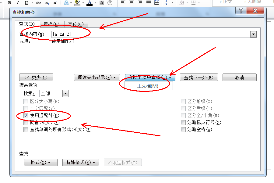 2、在查找内容输入框输入[a-zA-Z],勾选“使用通用字符”,然后点击“在以下选项中查找”,并选择“主文档”。
