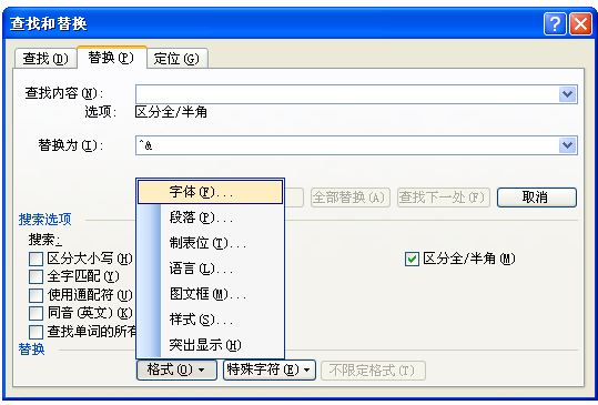 3、切换到“替换为”选项卡,在替换为输入框中输入^&,单击上图中的格式按钮,在弹出的下拉选项中选择字体命令;