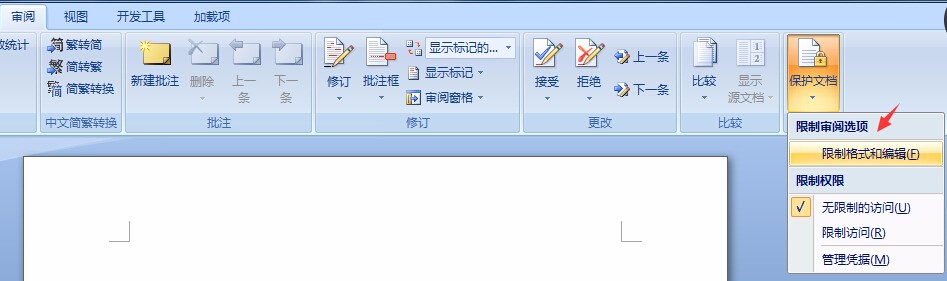 1、进入word2007并打开文档,然后点击“审阅”工具栏中的“保护文档”,然后选择“限制格式和编辑”,如图:
