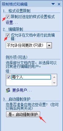 2、勾选限制对选定的样式设置格式以及编辑限制,然后点击“是,启动强制保护”按钮,如图: