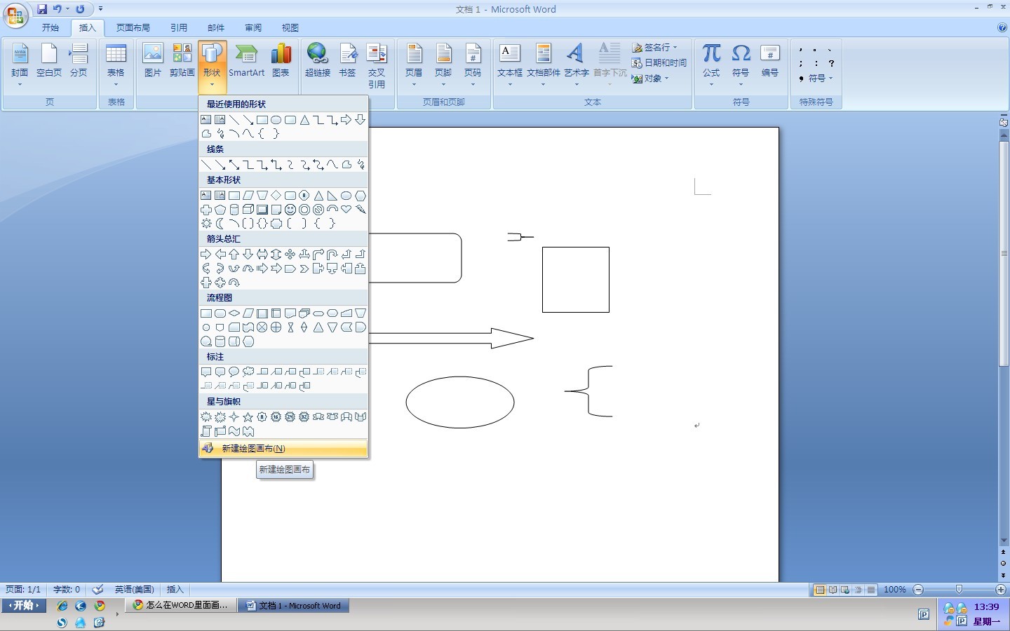 插入——>形状——>新建绘图画布。然后就在新建的图框里绘制……