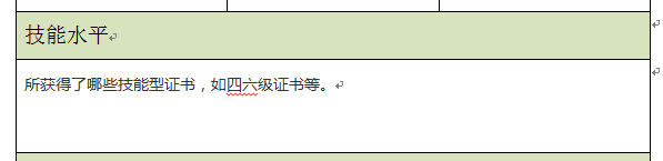 3.技能水平。自己在校期间所获得的技能型证书是十分重要的,能让别人知道你掌握了多少技能。比如能够熟练操作办公软件word以及EXCEL,会剪辑软件premiere/final cut pro等。因此,填写技能水平是很有必要的;