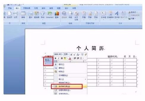 7、选中想要合并的两个格子,在阴影部分右键单击鼠标,选择合并单元格。如下图(七)