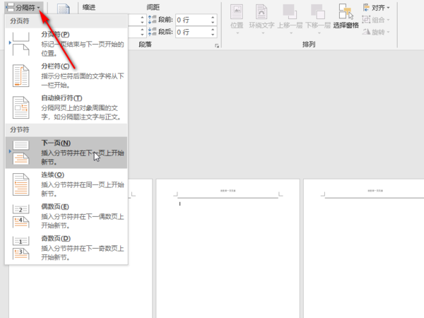 1.在word菜单中选择页面布局,点击分隔符旁边的倒三角,看到其中第一块是分页符,第二块就是分节符了,有4个类型,我们只要根据自己的需求选择即可。