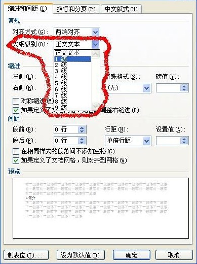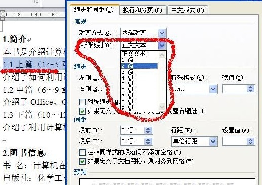 3.设置大纲级别。“1.简介”的大纲级别默认为“正文文本”,其为一级目录,因此,将其修改为“1级”。