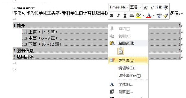 8.更新目录时,只需选中目录,鼠标右键弹出菜单,点击“更新域”。如果只想更新页码,那么在弹出的“更新目录”对话框中选择“只更新页码”即可。