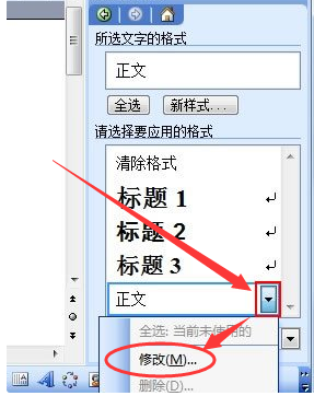 2、这时在Word界面的右侧会弹出【样式和格式任务窗格】,单击正文的小箭头,选择“修改”。