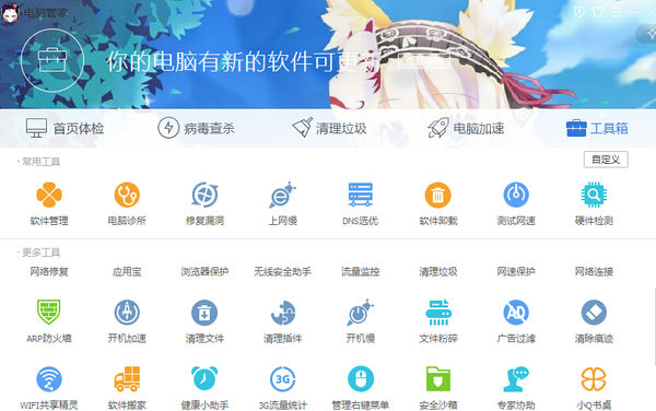 管家不但提供核心的杀毒防御功能,同时,还提供系统清理和电脑加速功能。此外,电脑管家10.0还有众多的实用功能,都集成在“工具箱”中。而且电脑管家10.0提供的这些附加功能,并不是强制安装的,大部分都是在用户有需要的时候,由用户自主决定是否要下载安装。