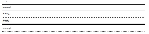例如,输入3个“-”后,按【Enter】键即可绘制一条横线;3个“~”得到波浪线;3个“#”得到中间加粗的三直线;3个“*”得到一条虚线;3个“=”得到双直线,