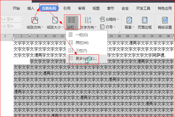 3、点击菜单栏“页面布局”,接着点击“分栏”,在弹出的下拉列表中点击“更多分栏”按钮。