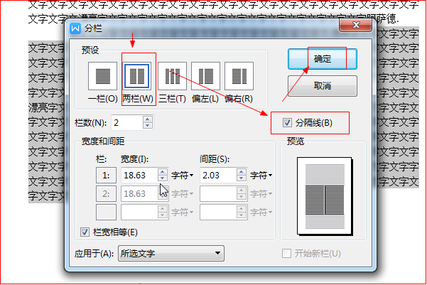 4、在弹出的“分栏”对话框中,在“预设”处点击选中“两栏”,然后在“分割线”前方的方框内打上对勾,最后点击“确定”。