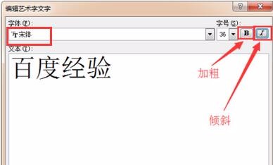 在弹出的“编辑艺术字文字”窗口中文本窗口输入需要添加的字体,我们输入“百度经验”为例,设置好字体样式和字号,点击确定;