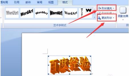 4、这时在文档中就显示出艺术字效果了,同时可以点击“格式”中的形状填充以及形状等,如图: