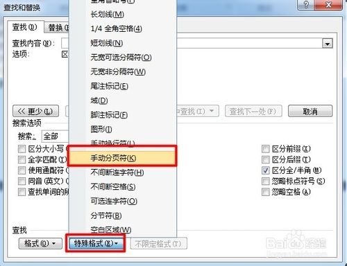 方法三:也是稍微复杂的方法,按ctrl+f,找到替换标签里的特殊字符,选择手动分页即可。点击替换所有。