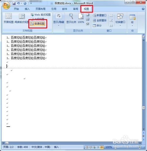 1、点击菜单栏"视图"->"普通视图",如下图(注:Word2003版和Word2007是“普通视图”,2010、2013设置为“草稿”)