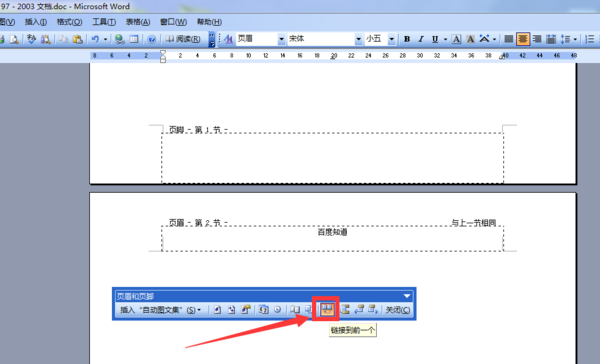 3、在需要删除页眉的那页上,双击页眉区域,接着在出现的”页眉和页脚“窗口上点击一下”链接到前一个“;