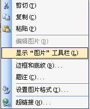 1、选中图片,单击鼠标右键,在弹出的快捷菜单中选择显“图片”工具栏命令;