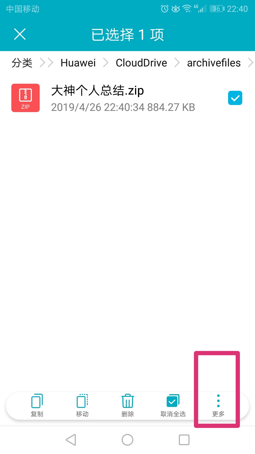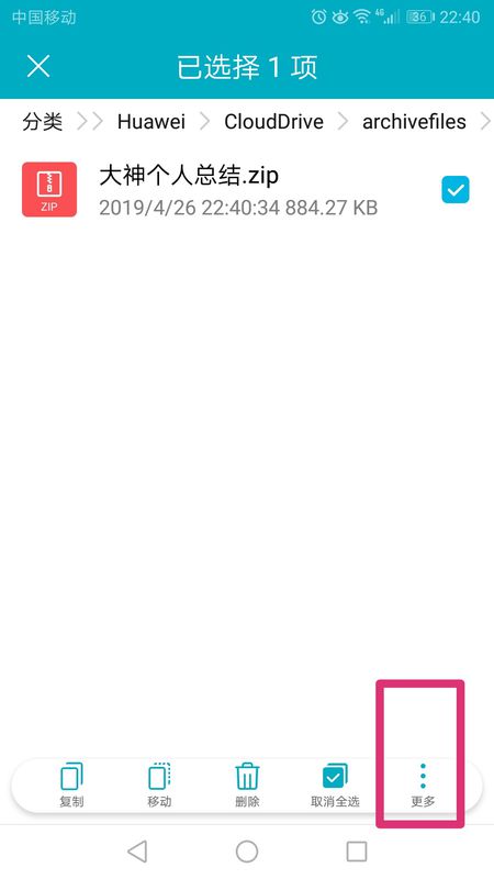 1、如图,找到自己想要打开的zip压缩包,长按3-5s,出现如图界面,找到更多,点击进入。