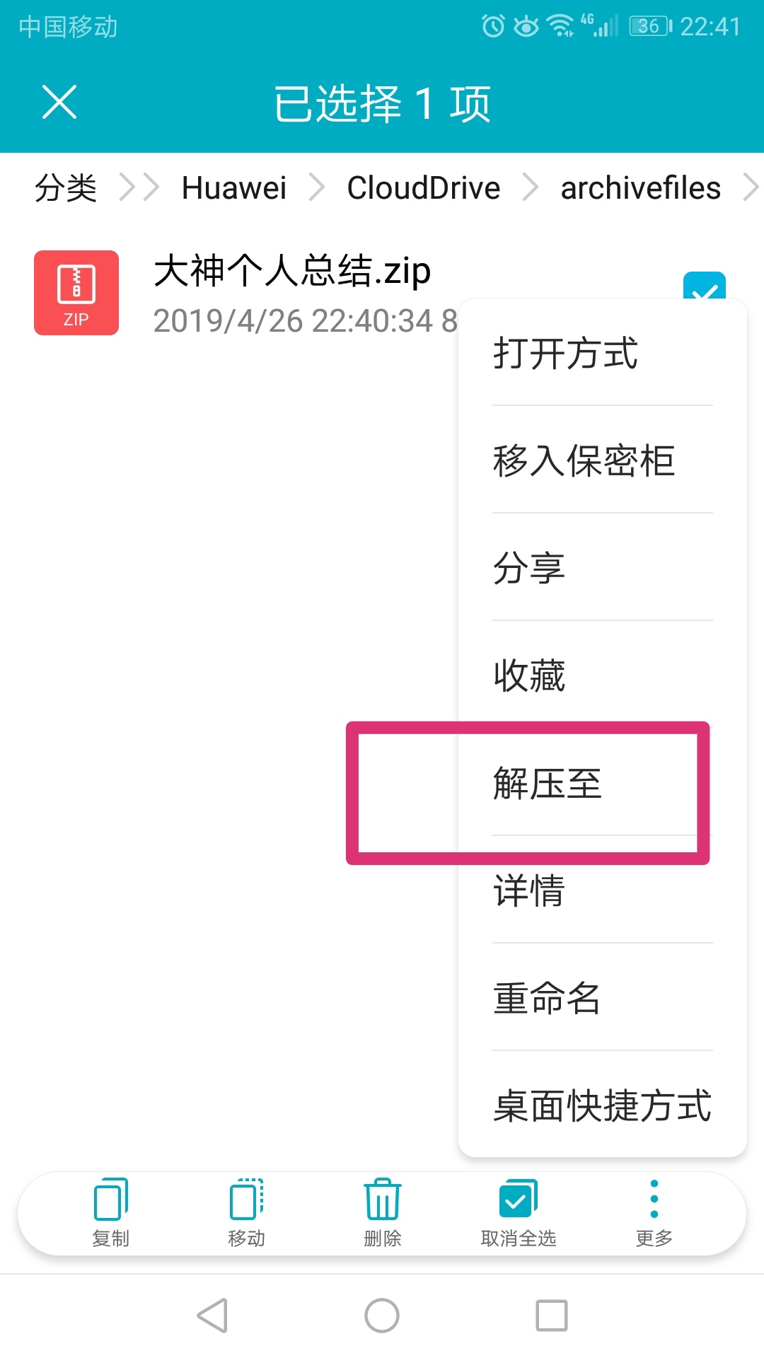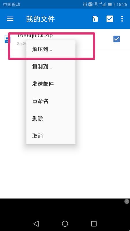 4、长按手机屏幕,出现解压到,如图,点击解压到,