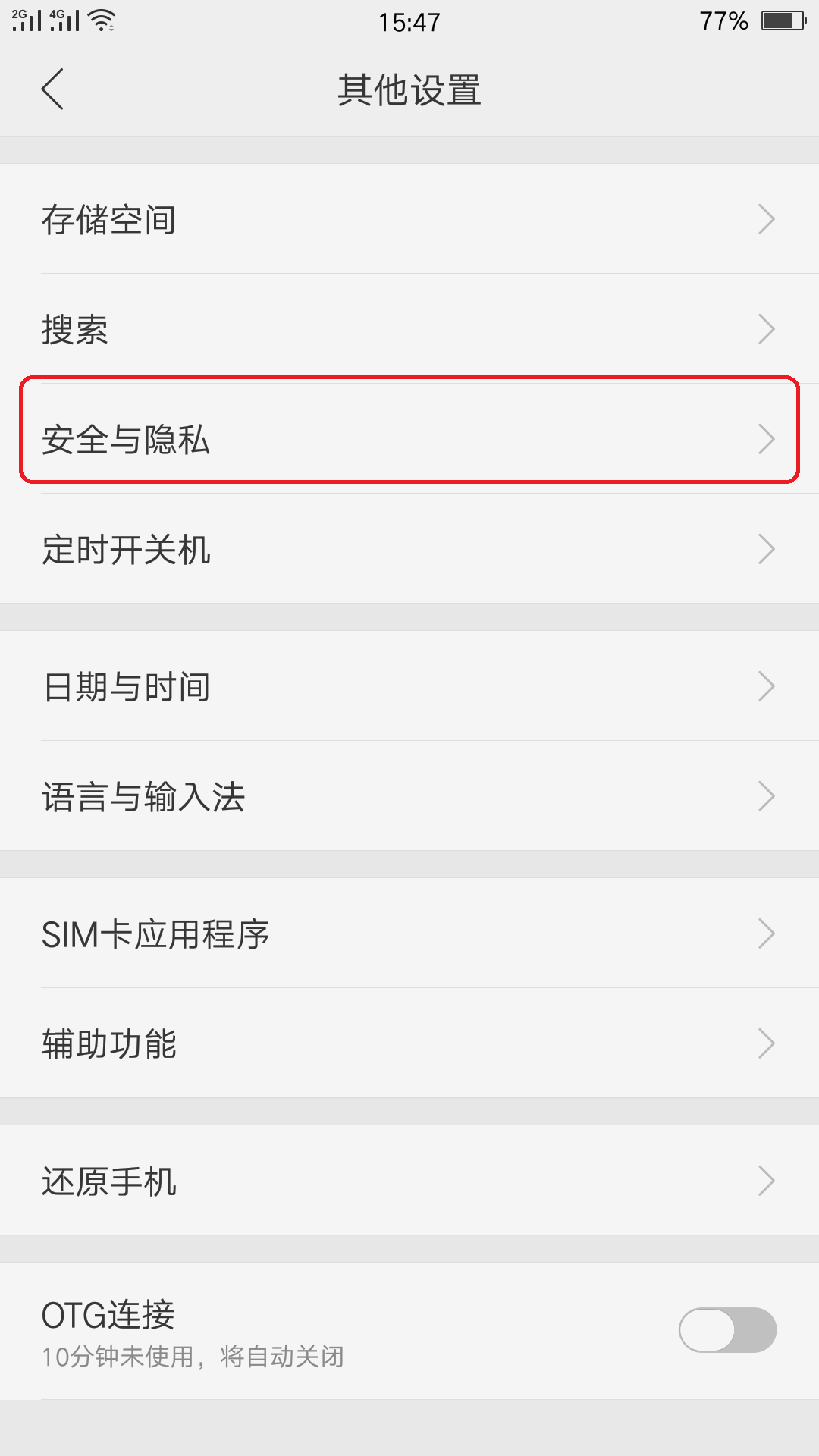 三、进入其他设置以后,找到”安全与隐私“并点击进入。