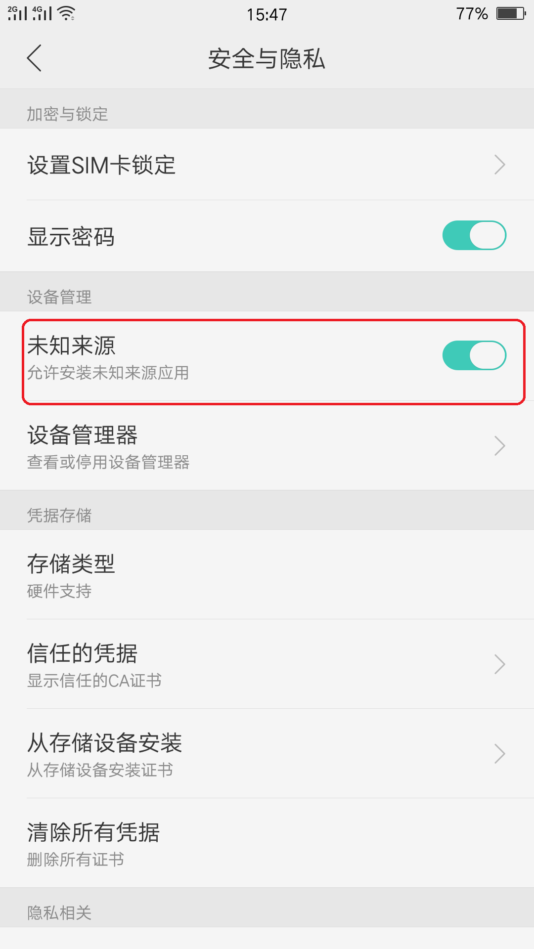 四、进入以后将”未知来源“一项的开关开启即可。