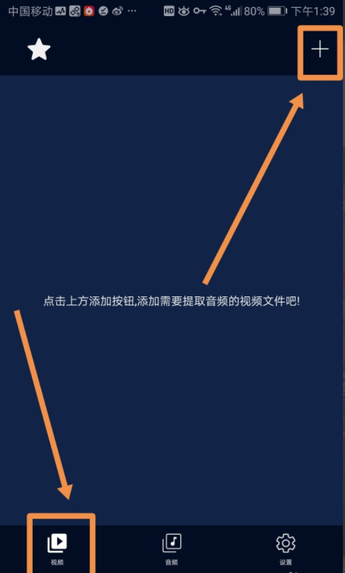 2.进入音频提取器主界面后点按界面左下方的视频标志,然后点按界面右上角的加号标志以添加需要提取音频的视频。