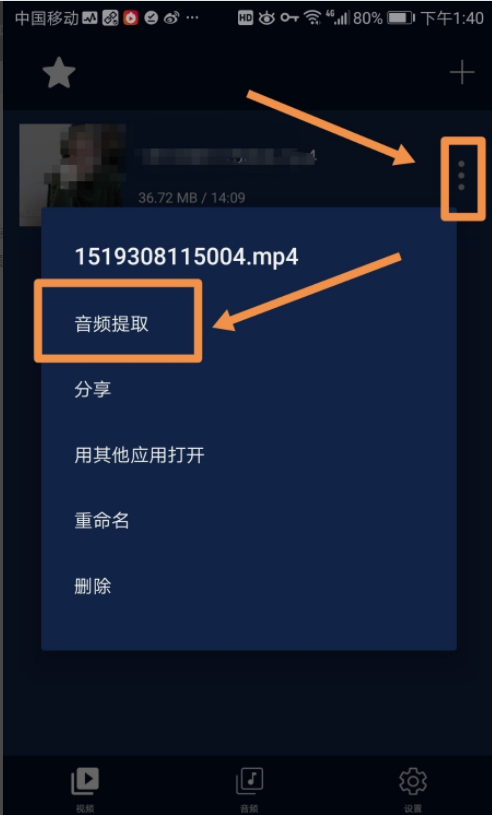 4.此时视频已经添加到应用界面中了,点按右侧箭头指向的三点标志,在弹出的菜单中点按音频提取标志。