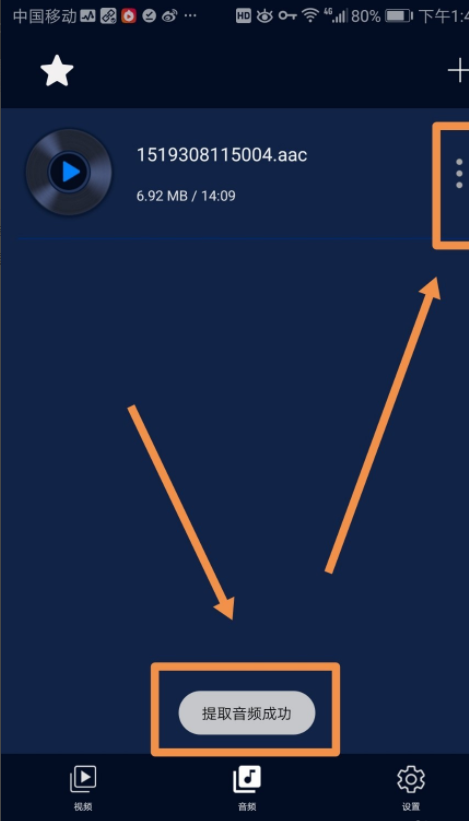 5.大约一秒不到的时间,音频提取完成,界面下方出现提示提取音频成功,再次点按界面右上方的三点标志。