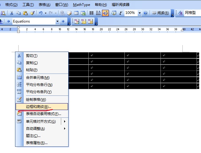 2、第二步全选表格,鼠标右键表格线,选择边框和底纹。