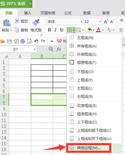 第二步:点击开始选项下”田字格“形状右侧的下拉小三角,若列表内没有符合条件的边框则选择最下面的”其他边框“选项。