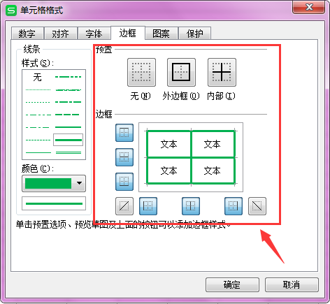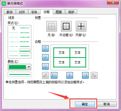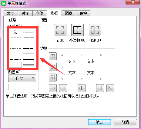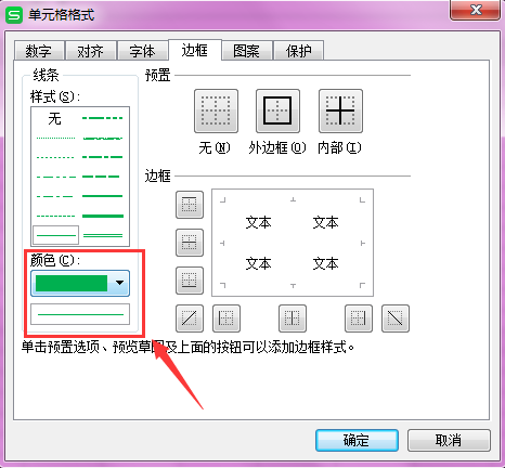 第五步:确定了样式和颜色以后对表格边框的哪条边框线需要添加进行设置。在”预置“栏有外边框和内边框的快捷选择,也可以在”边框“栏逐条选择。