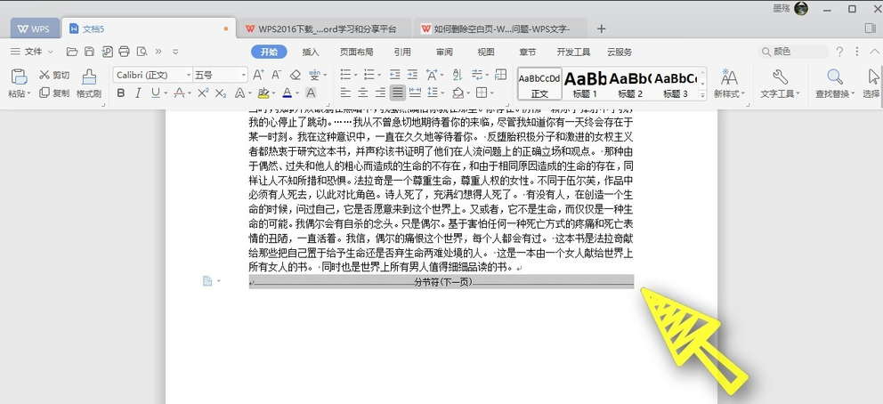 3、使用鼠标左键选中这一个分节符,然后按键盘上面的删除键,把分节符删除了