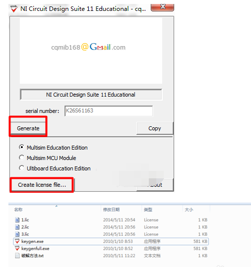 2.运行kegen.exe文件,如图,点击Generate产生序列号,版本选第一个教育版即可,不需要改;然后点击Create license file 生成.lic文件,保存在除C盘以外的硬盘中,名字随便;按照上述方法产生3个license文件;