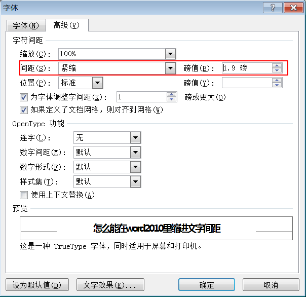- 在【字符间距】选项卡中,单击【间距】下拉按钮,选择【紧缩】选项,在【磅值】微调框来设置紧缩的程度,单击【确定】按钮,