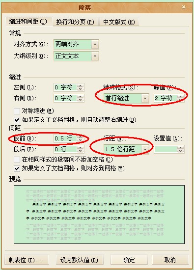 WORD中设置正文各段【首行缩进2字符、1.5倍行距、段前间距0.5行】怎么弄