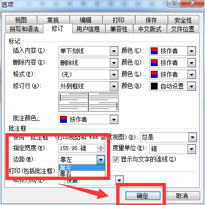 2、弹出修订选项对话框,在批注框的边距选择靠左即可,如图所示。