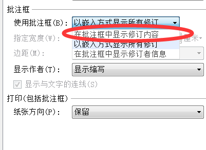 4、在打开的“修订”页面中将“批注框”选择为“在批注框中显示修订内容”。