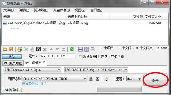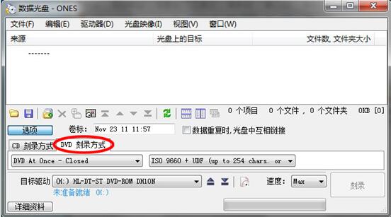 你应该先一步头把要刻录的文件放在同一个文件夹中(主要是添加方便),然后放入光盘,选择ones当中的刻录数据光盘,添加你的文件