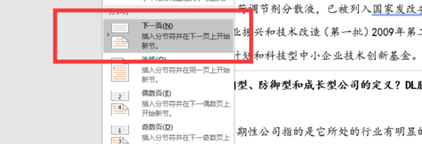 先将光标定位在想要分到另一节的第一个段落的第一行的开头,单击“插入一分隔符”,打开“分隔符”对话框。在“分节符类型”下选中“连续”后,单击“确定”即可。这时就在此行的位置插入了一个分节符,原光标所在位置及其后面的字符会自动下移一行(在默认的“页面视图”下,刚才插入的分节符是看不见的。切换到普通视图方式下,分节符就显示出来了)。